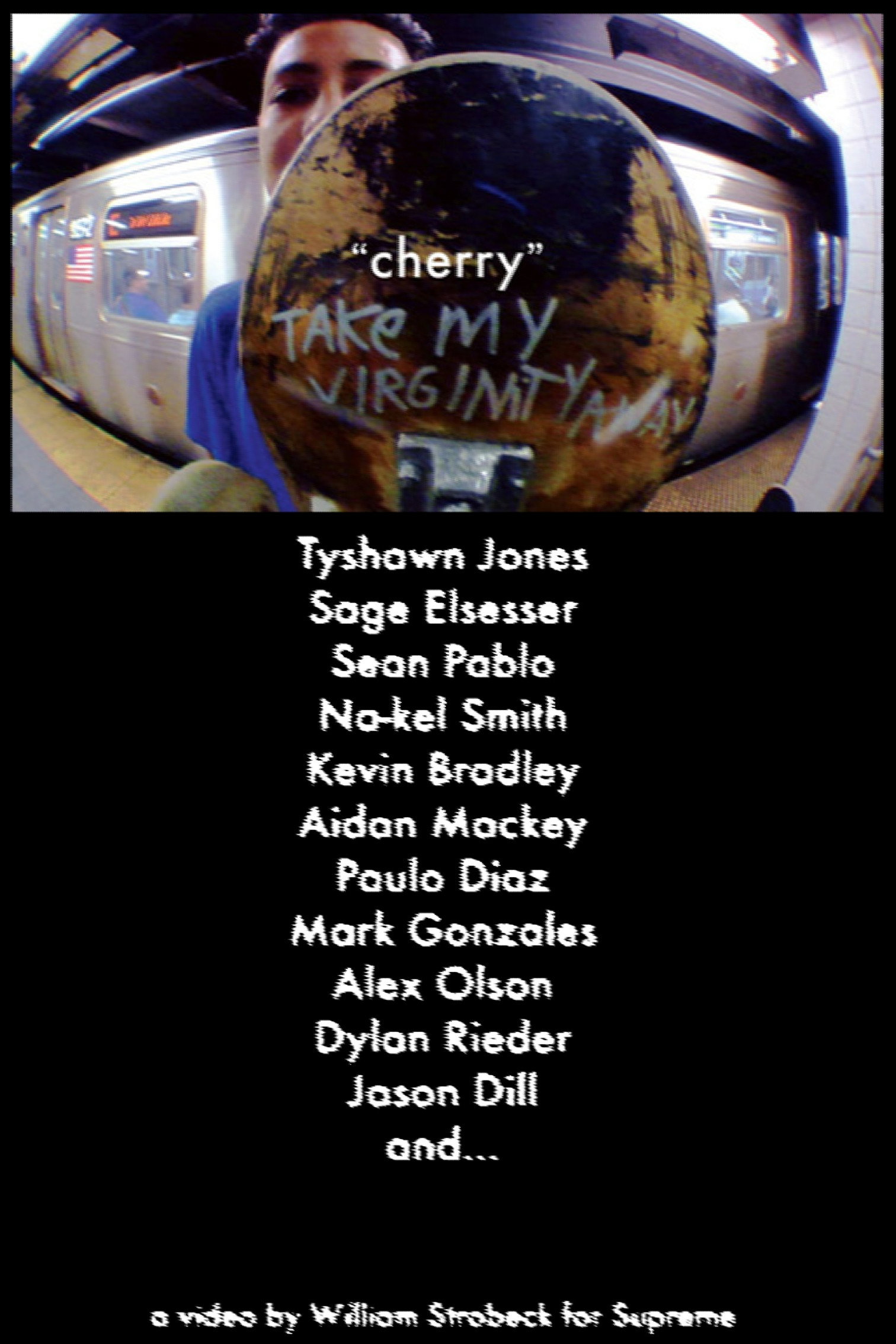 Supreme presents, "cherry" a video by William Strobeck featuring Tyshawn Jones, Sage Elsesser, Sean Pablo, Nakel Smith, Kevin Bradley, Aidan Mackey, Paulo Diaz, Mark Gonzales, Alex Olson, Dylan Rieder, Jason Dill…